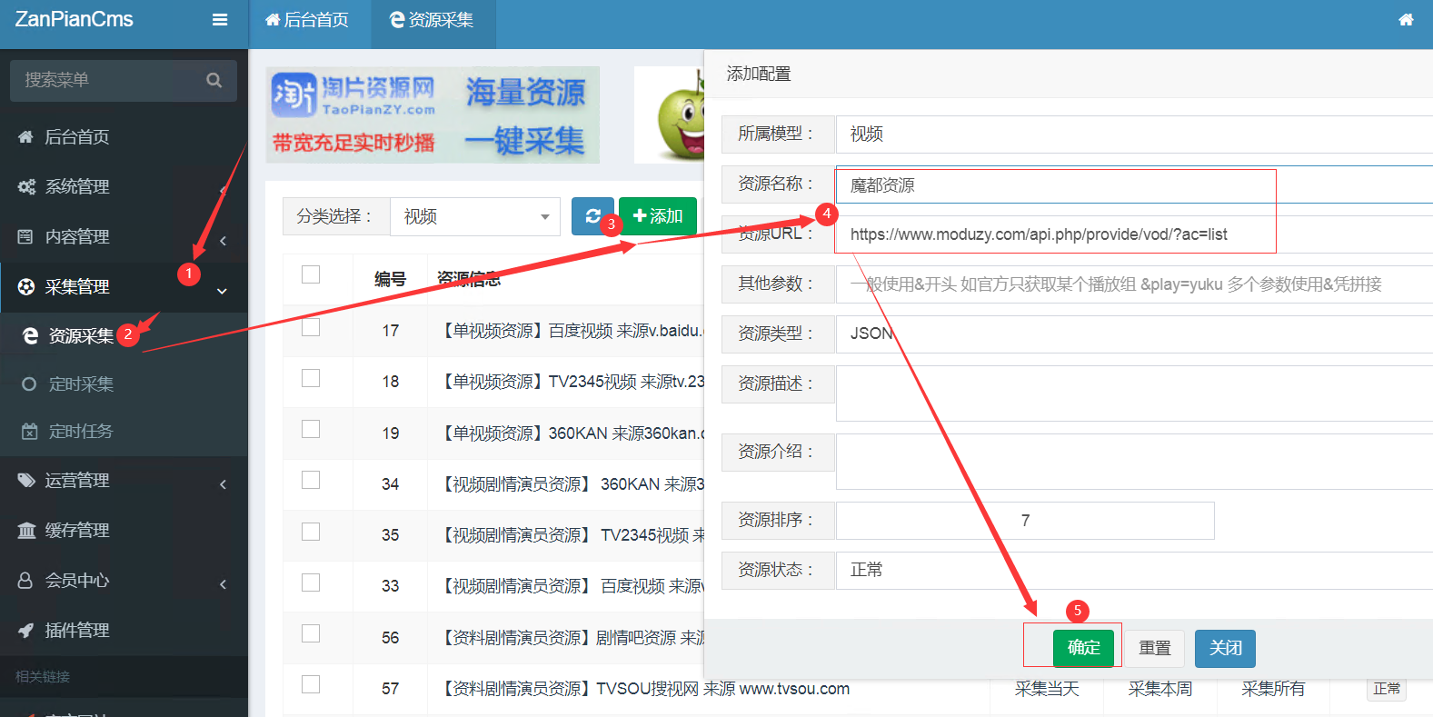 请按以下步骤进行:依次点击【采集】-【视频资源库】-【添加资源库】,然后依次操作